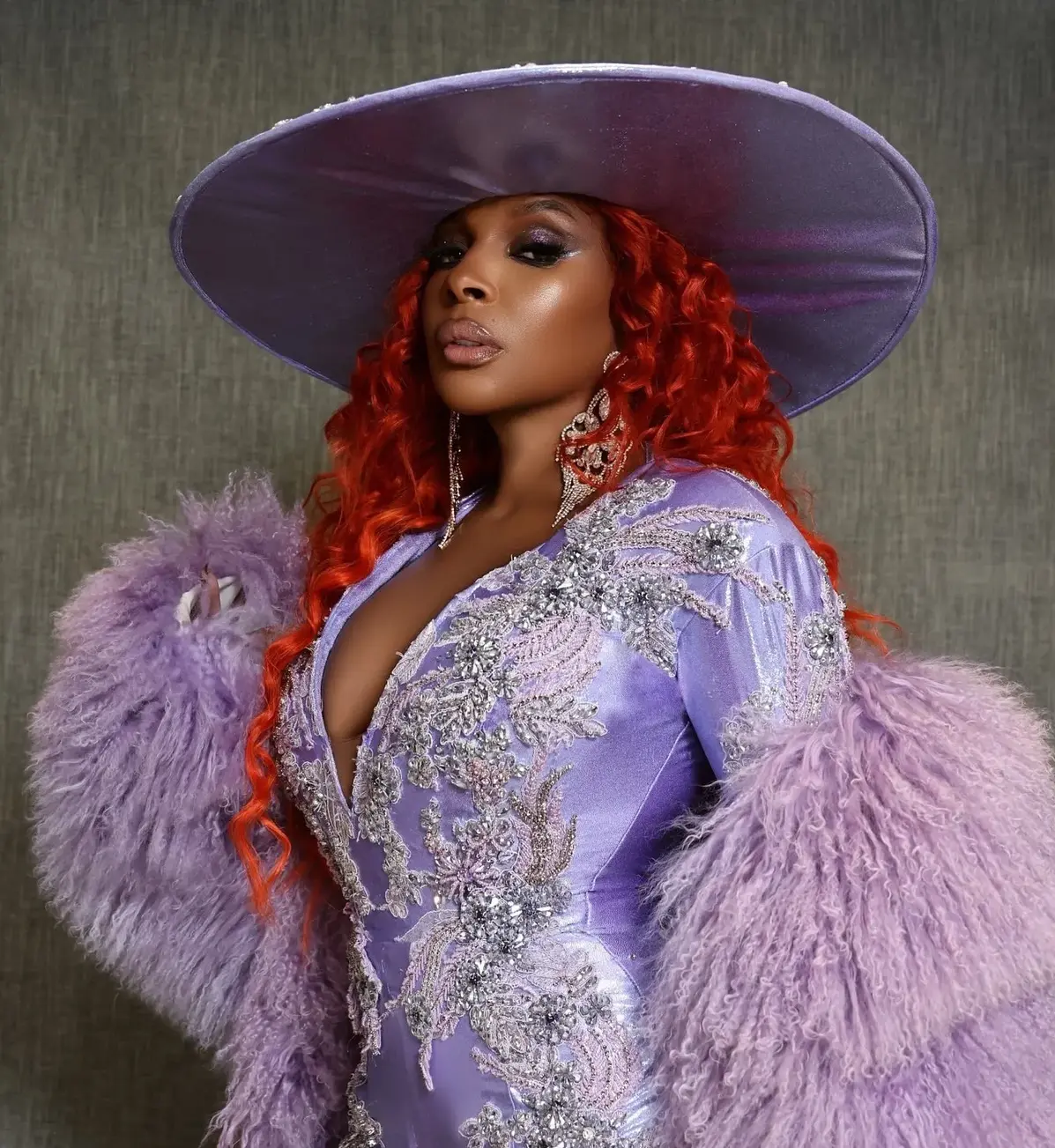 На сцене Мэри предстала в фиолетовом костюме от Walter Collection, который был создан специально для неё. Этот наряд подчеркнул её уверенность и стиль. Дополнила образ эффектная куртка из лилового монгольского меха от FGM Bespoke, которая добавила образу роскоши и тепла.